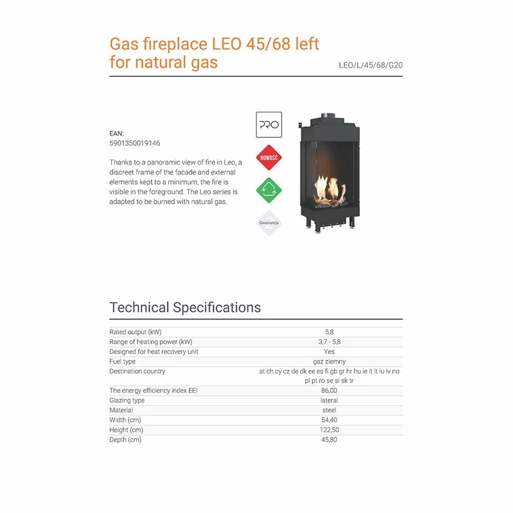 Ενεργειακό τζάκι φυσικού αερίου αριστερή γωνία KRATKI LEO/L/45/68/G20