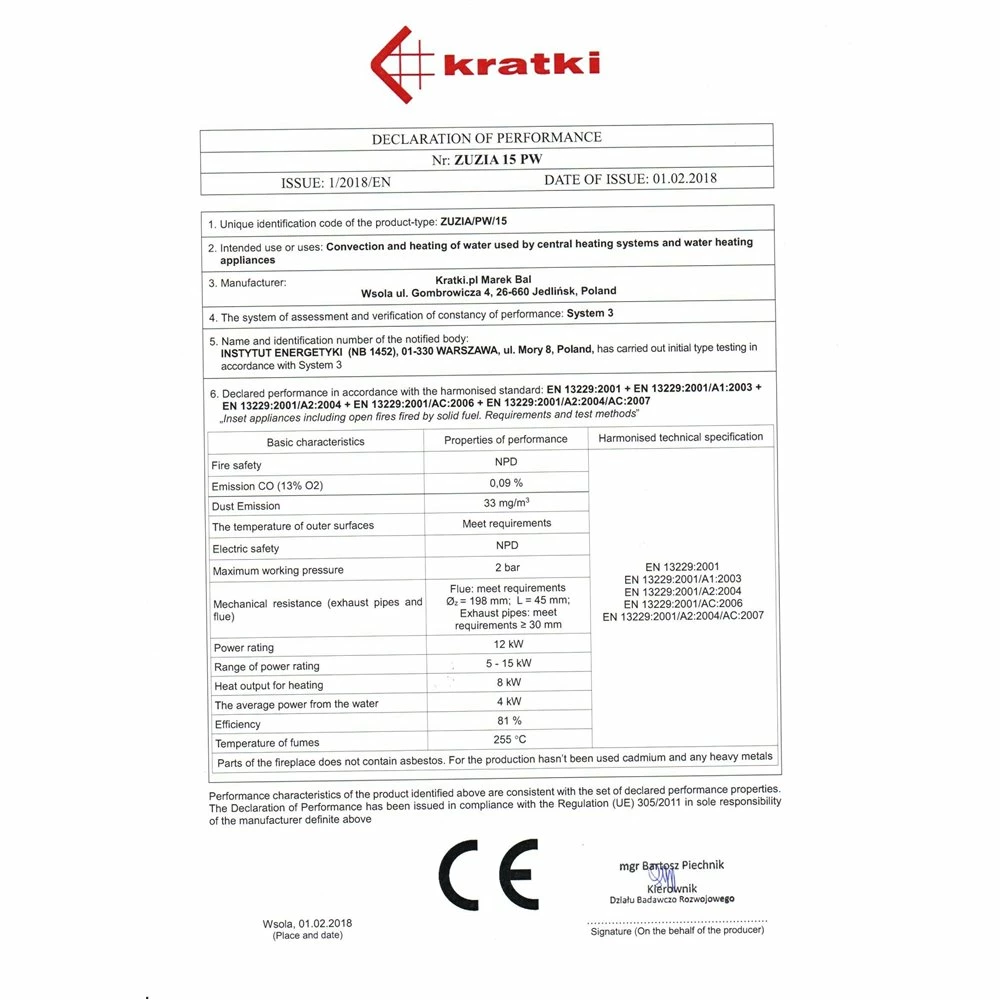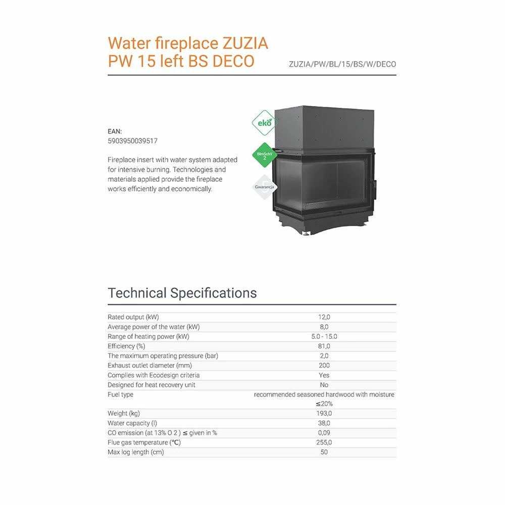 Ενεργειακό τζάκι καλοριφέρ αριστερή γωνία κλειστού δοχείου KRATKI ZUZIA/PW/BL/15/BS/W/DECO 12KW / 120-150m2